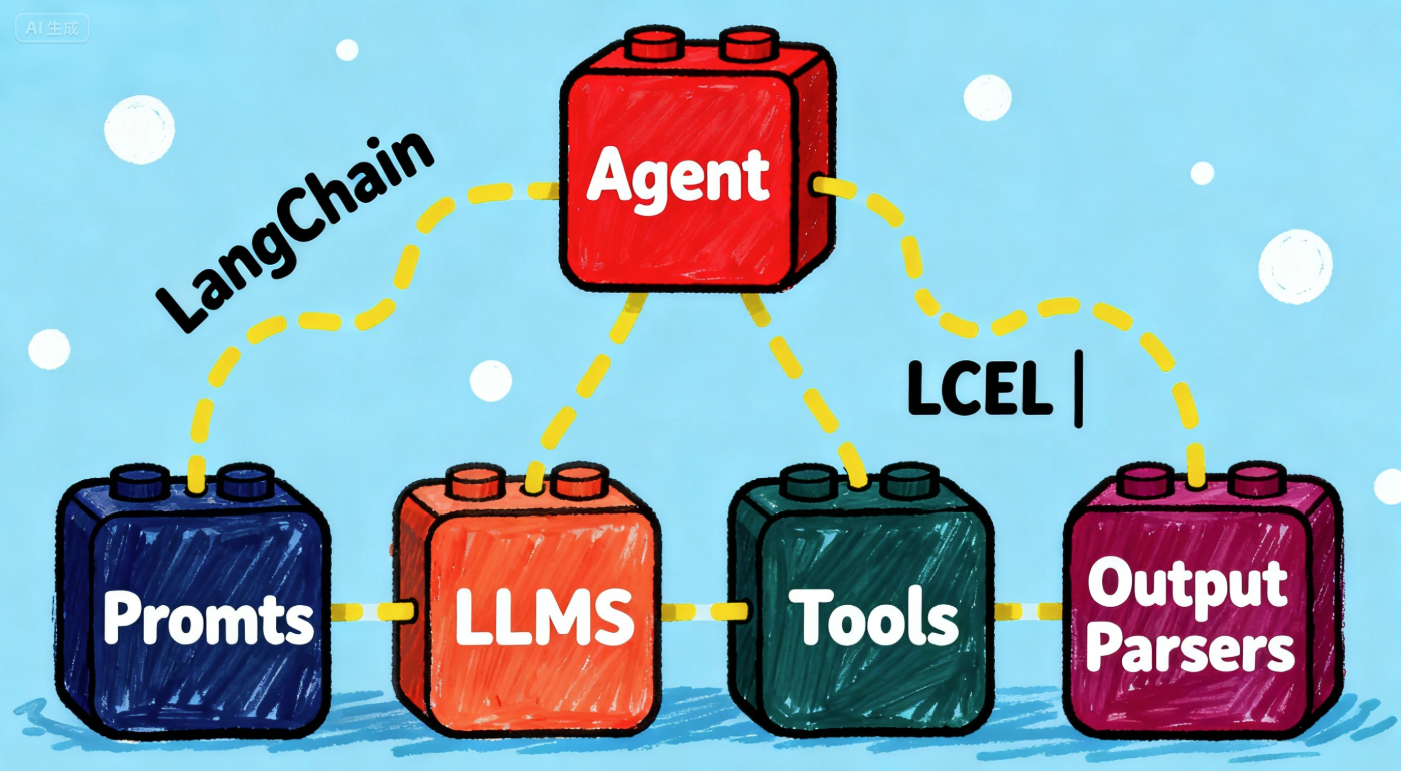 提供了“组件化”的便利: LangChain 提供了大量标准化的组件(Components),如 Prompt 模板、模型 I/O、输出解析器(Output Parsers)、工具(Tools)等。这使得开发过程像“搭积木”一样,开发者可以专注于业务逻辑的编排,快速组合出一个完整的应用,极大提升了研发效率。