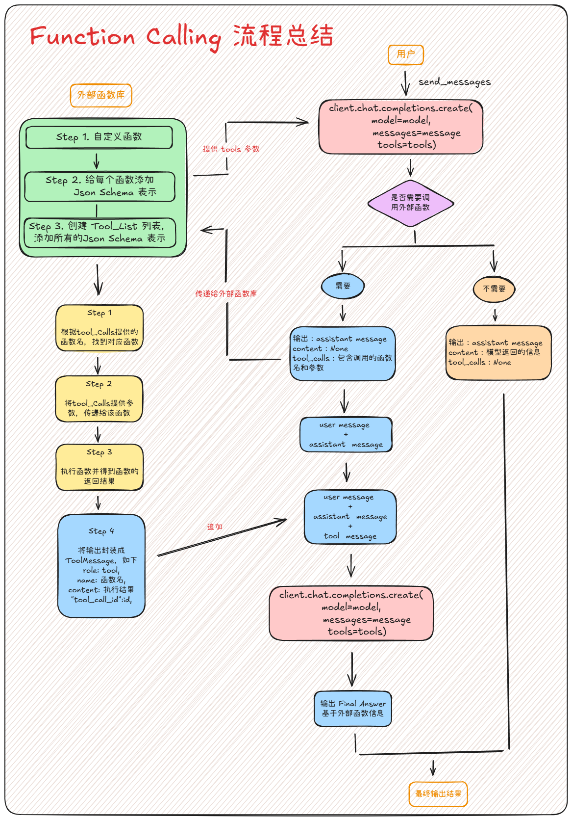 至此,一次完整的 Tool Calling 循环结束。AgentExecutor 通过这个严谨的“调用-执行-回传-再调用”流程,实现了 LLM 与外部世界的可靠交互。